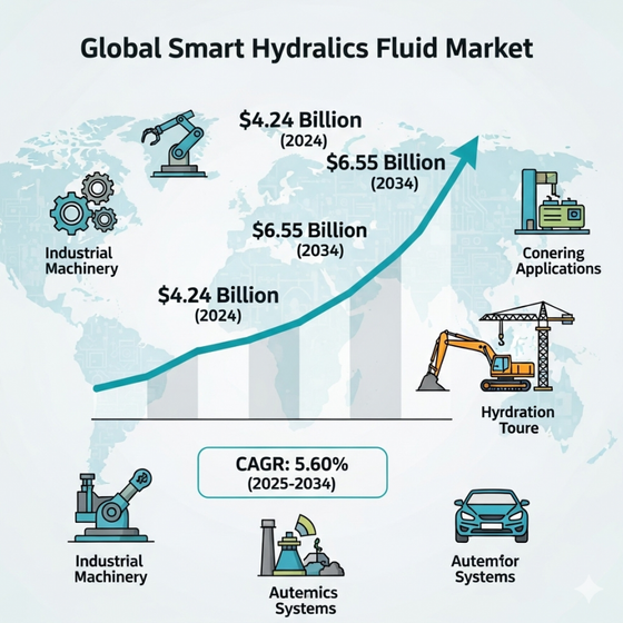 PUNE, MAHARASHTRA, INDIA, September 25, 2025 /EINPresswire.com/ -- The global smart hydraulics fluid market size was valued at USD 4.24 billion in 2024 and is projected to reach USD 6.55 billion by 2034, growing at a CAGR of 5.60% between 2025 and 2034. This growth is driven by increasing adoption of smart hydraulic systems in industrial machinery, construction, automotive, and aerospace applications, as well as rising demand for energy-efficient and environmentally friendly hydraulic fluids.